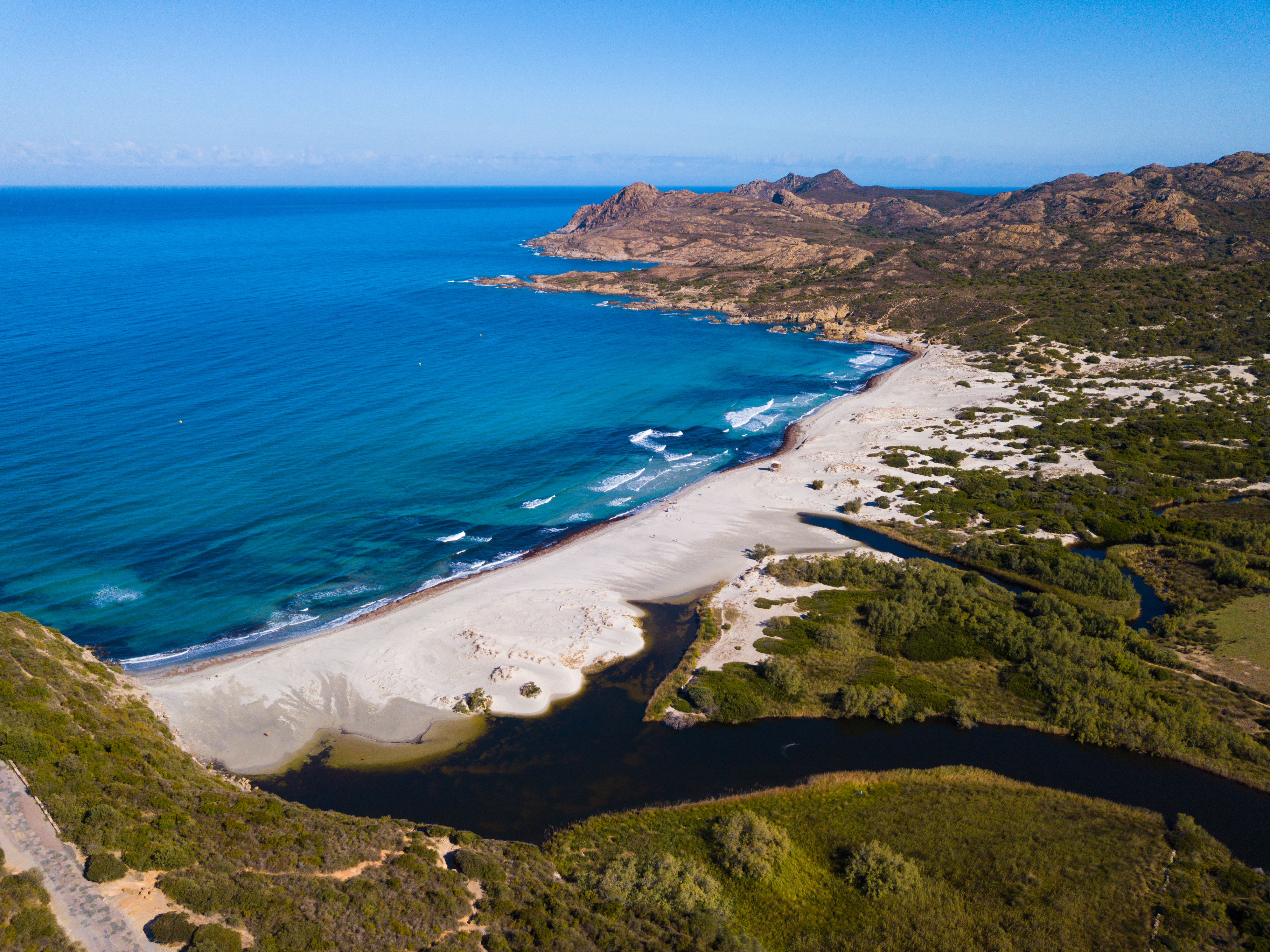 L'atmosphère reste authentiquement sauvage : aucune construction n'altère l'horizon, seules quelques vaches corses paissent librement dans les dunes en arrière-plan. Les étangs de Foce et Cannuta bordent la plage, créant un écosystème riche où nichent de nombreux oiseaux protégés. Le sable blanc contraste avec des touches de sable noir volcanique, tandis que l'eau décline tous les tons de turquoise et d'émeraude.